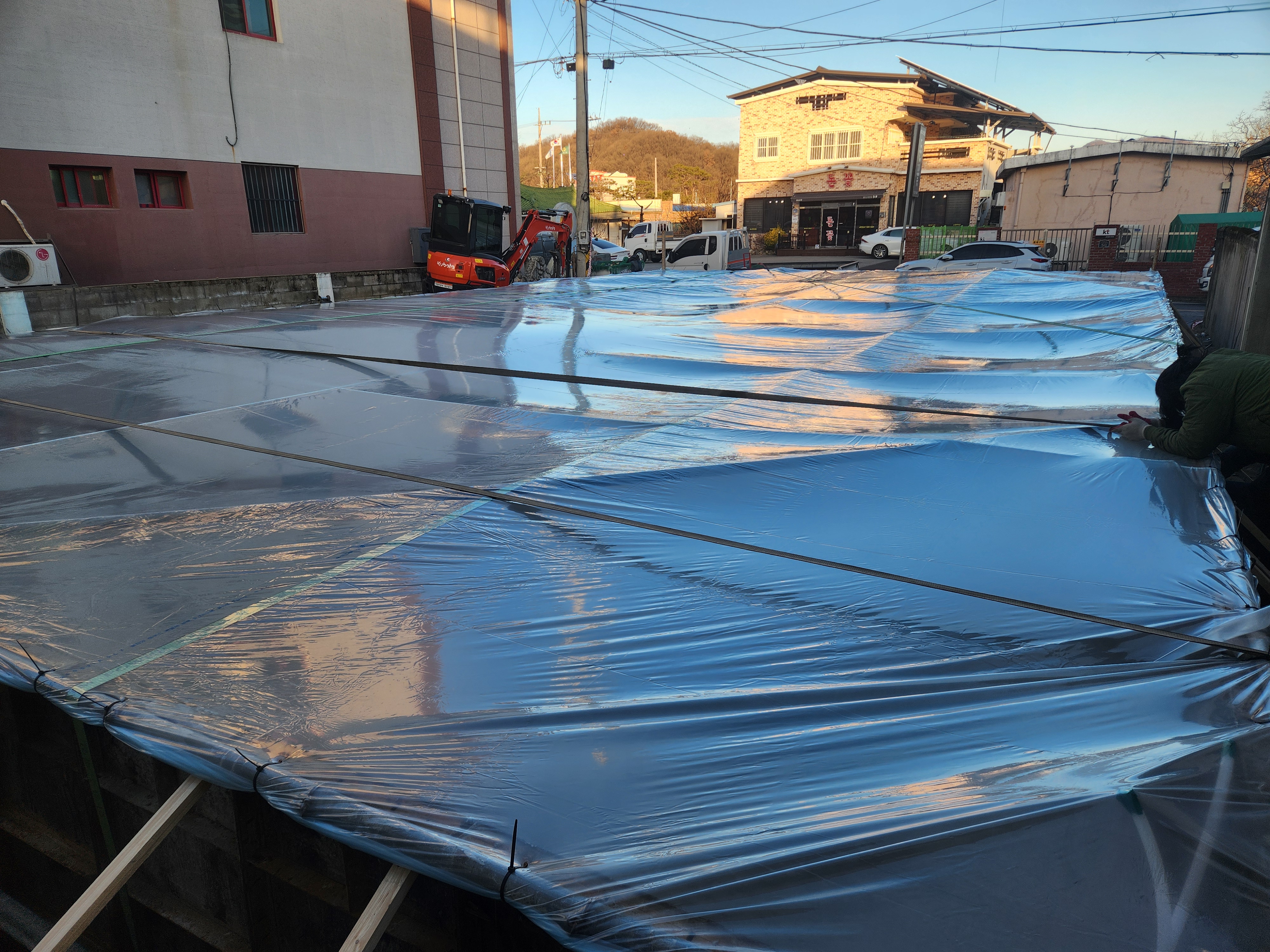 우천 및 기온 변화에 대비하여 상부 비닐 보양 작업을 진행했습니다.
